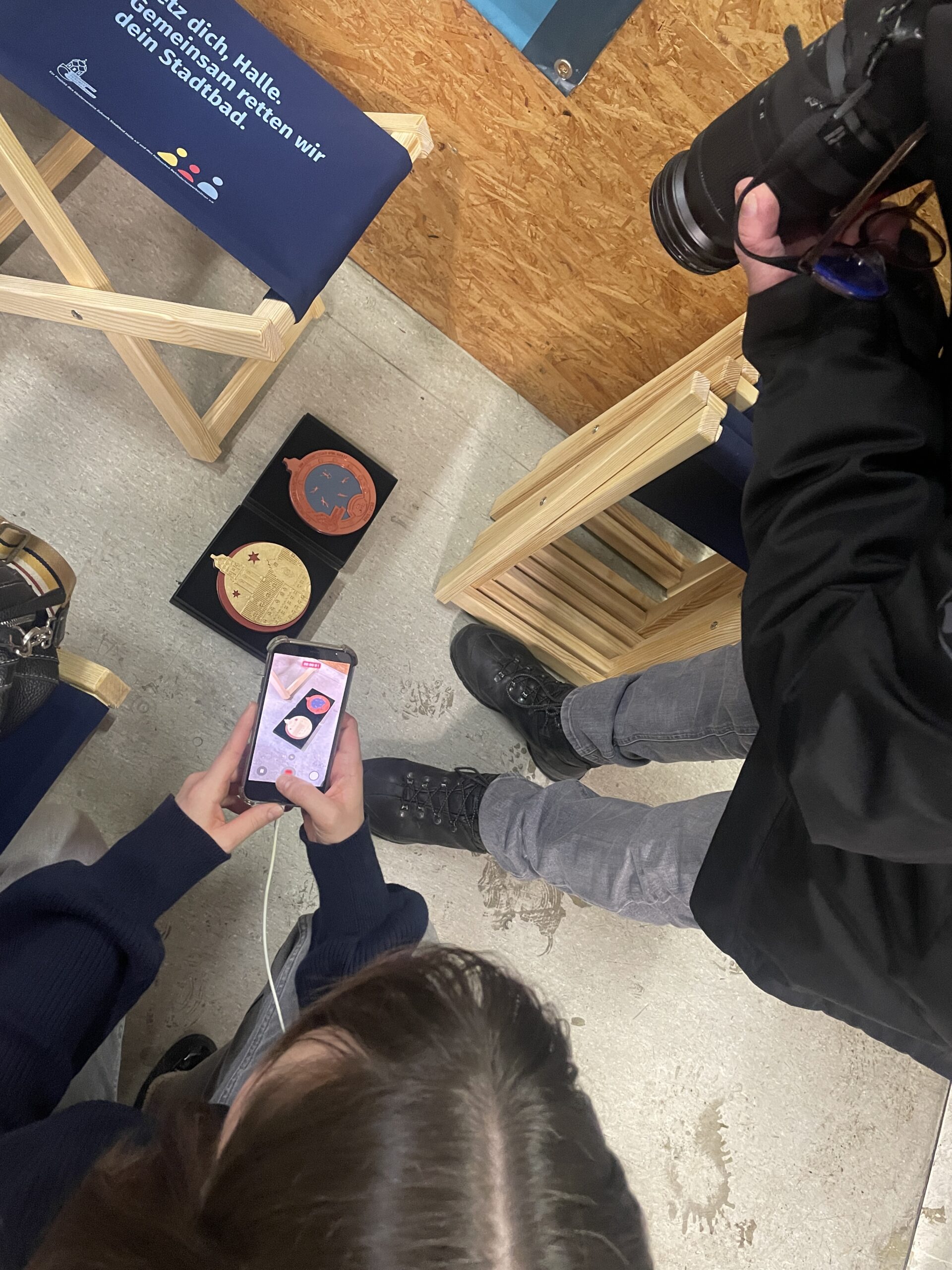 Für die Veranstaltungen ließ der Förderverein eigens Klapphocker in den Behindertenwerkstätten herstellen. Werkstattleiter Herr Schwarz brachte sie persönlich zur Veranstaltung – versehen mit dem Slogan: „Setz dich, Halle. Gemeinsam retten wir dein Stadtbad.“ Die Hocker wurden nicht nur praktisch genutzt, sondern setzten auch ein sichtbares Zeichen für Inklusion, lokale Zusammenarbeit und die Verbundenheit vieler Hallenser Einrichtungen mit dem Stadtbad.